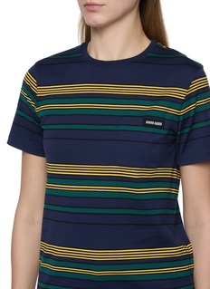 MIU MIU 擅用色彩与细节营造甜酷氛围,风格鲜活而精致。这款 T 恤采用合身剪裁,多色条纹拼接和 LOGO 拼贴细节尽显复古青春气质。