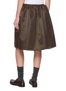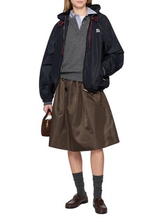Miu Miu 这款半裙以尼龙缎面衬出柔润光泽,花苞廓形自带蓬松灵动感,低调标识细节添质感。搭简约白 T 显松弛,配精致上衣衬优雅,是日常与轻社交场合都适配的精致基础款。