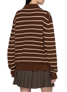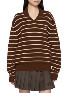 Miu Miu 这款休闲 POLO 衫以粗犷横条纹与宽松廓形重新诠释学院风元素。经典领型与罗纹饰边奠定设计基调,刺绣标识则低调彰显品牌辨识度。
