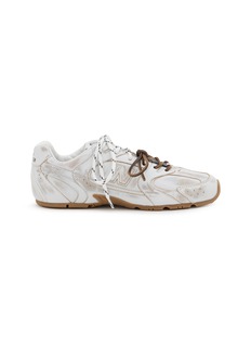 复古效果皮革款式源自 Miu Miu 与 New Balance 的联名系列。 Miu Miu 使结构焕然一新,带来俏皮轻盈的感觉,同时以色彩与质感对比大玩鞋带设计。 标志为设计注入经典品味。
