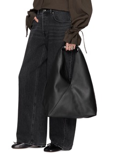 The MM6 Maison Margiela tote is a testament to minimalist design fused with practicality. This sleek, structured bag is crafted from supple black leather, featuring a unique triangular silhouette that stands out with its clean lines and modern aesthetic. The innovative silver-toned metal handle adds a futuristic touch, while the spacious interior provides ample room for all your essentials.