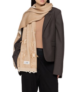 MM6 Maison Margiela 注重在实验精神和实用主义之间追求平衡。这款针织围巾饰有标志性 LOGO 标签,错乱的编织纹理打破日常,挑战时尚常态。