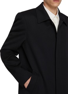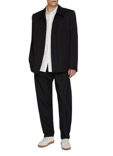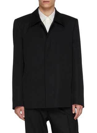 Precision defines this jacket through MM6 Maison Margiela’s restrained tailoring lens. Cut in compact wool gabardine, its clean lines and concealed front create a composed silhouette—ideal layered over shirting for work or styled pared-back with matching trousers.