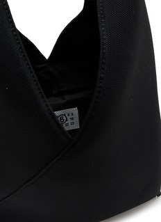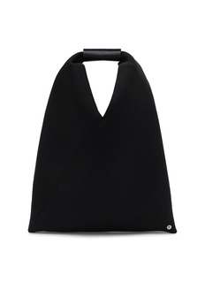 Introducing the MM6 Maison Margiela black triangular tote, a masterpiece of minimalist design. This innovative accessory showcases a striking geometric shape that redefines the conventional tote silhouette. Crafted from a resilient textured fabric, this bag combines durability with a sleek, contemporary look. The unique handle is designed for comfort and ease of carrying, making this tote both practical and stylish.