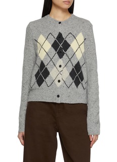 Heritage charm is reimagined with a softer, modern tactility in this wool-blend cardigan by MO&Co.. Rendered in a Donegal-inspired knit, its speckled texture sets the stage for a bold argyle motif that feels both nostalgic and graphic. The classic crew neckline and clean button front make it an easy layering piece for denim, pleated skirts, or tailored trousers.