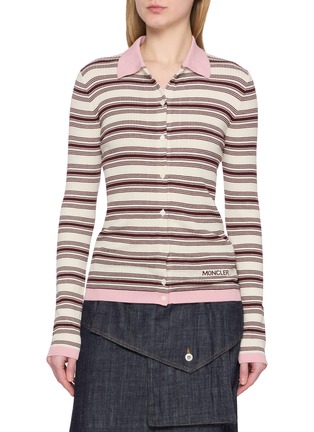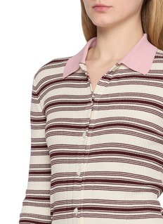 A soft graphic rhythm defines this knit, where horizontal stripes bring a gentle retro note. Finished with a contrasting polo collar, it balances ease and structure—ideal with tailored shorts or a relaxed skirt for polished everyday dressing.