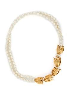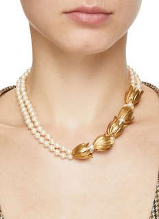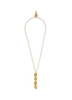 Monshiro 以日本一年四季为灵感,通过作品颂扬传统日本文化。这款项链以黄铜、棉珍珠、木珍珠、玻璃勾勒出花朵颗颗连缀的叮铃,散发出怀旧温和的氛围。
