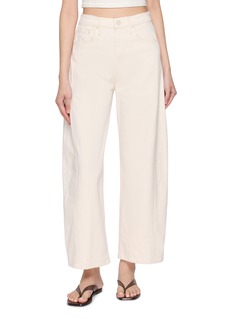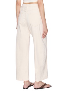 A super-high rise meets a sculpted wide leg in this clean, minimal take on the half-pipe silhouette. Cut in a soft off-white wash, the shape curves gently through the leg before finishing at an ankle-length hem—bringing an elevated, gallery-quiet freshness to tanks, knits and sleek sandals.