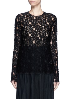 Ms MIN新季系列呈现了繁复精细的做工,此款蕾丝上衣富有独特的花卉图案,触感柔软且带有透视效果,加入系列主打之一的不修边设计,注入特色细节感,优雅大气又不乏个性。