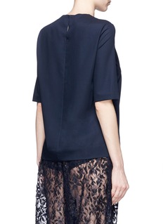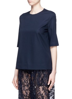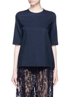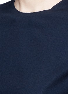 Ms MIN 2016春夏系列受东方传统武术文化启发,糅合品牌崇尚简约风格,让女士们轻松打造知性的都市形象。这款T恤采用来自意大利的羊毛纺织面料,带来舒适惬意的体验,颈背处的小镂空设计为单色款式注入细节感,配以略为宽松的版型,在简约中透出您的随性格调。
