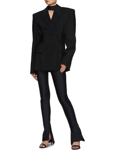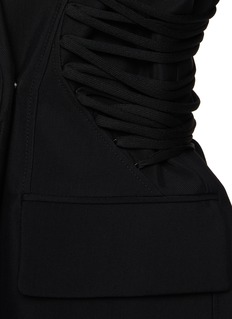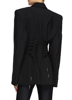 MUGLER 巧妙将工业几何造型应用于服饰,演绎抽象艺术审美,赋予作品丰富想象。这款西服外套拥有系带收腰设计,与垫肩廓形形成对比,带来气场轻松提升。