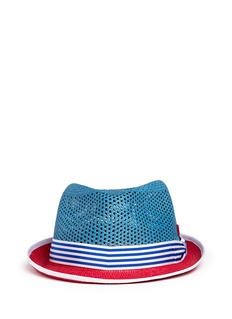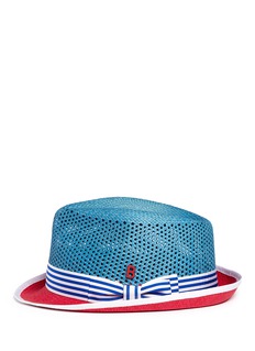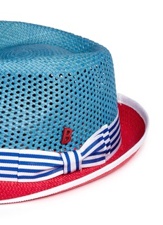 My Bob运用丰富色彩呼应了今季的设计灵感来源:摩洛哥古城马拉喀什。这款巴拿马草帽拥有顶部微凹的经典廓形,红、白拼蓝色的天然草编帽身做工精细,镂空设计提升了透气度,条纹缎带配以蝴蝶结饰,让您更显得甜美怡人。