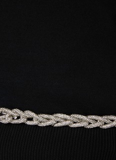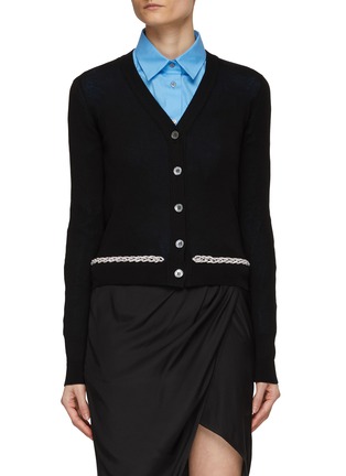N21 以合身廓形和丰富质感的面料演绎现代意大利风格。这款针织开衫巧用线材带来银丝链条般的立体腰间点缀。
