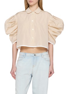 立体褶饰泡泡袖与短款剪裁,构成这件衬衫的核心辨识度。Nackiyé 选用挺括面料打造利落线条,宽松廓形适配多元搭配,翻领门襟作为标志性细节,是复古慵懒风格融入日常穿搭的关键单品。