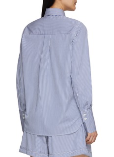 A refined reinterpretation of classic shirting, this cotton shirt balances precision with ease. Woven from Thomas Mason fabric, fine stripes run cleanly through the body, while the rounded collar and concealed buttons deliver a quietly polished finish—ideal worn loose over shorts or tucked into tailored separates.