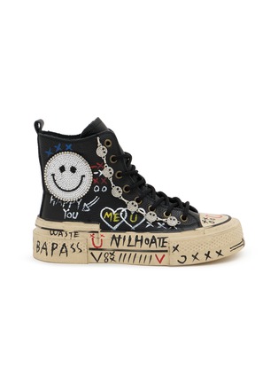 Step into a whimsical world with Nan-Ku Couture's black high-top sneakers. These sneakers are a canvas of creativity, featuring a playful and engaging smiley face design adorned with sequins and embroidery, radiating joy and positivity. The unique chain embellishments with skull motifs add an edgy contrast to the cheerful aesthetic. Each shoe is finished with hand-written messages and symbols on the rubber sole, promoting themes of love and unity.