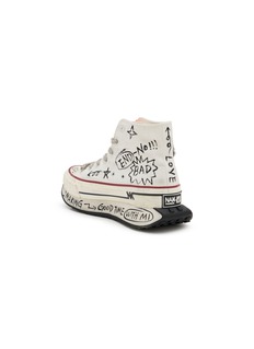 Discover the enchanting charm of Nan-Ku Couture's white high-top sneakers. These sneakers exude a playful yet profound message with their hand-crafted designs featuring beads, sequins, and expressive doodles. The heart motifs and playful symbols like stars and clouds are intricately placed across the canvas, symbolizing love and positivity. The unique touch of an orange lace toggle adds a pop of colour, enhancing the whimsical aesthetic.