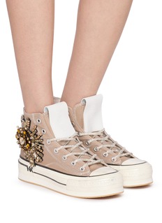 Step into elegance with Nan-Ku Couture's taupe high-top sneakers. These sneakers are adorned with an opulent crystal embellishment that radiates from the side, resembling a luxurious brooch. The muted taupe canvas provides a perfect backdrop for the sparkling stones and metallic details, creating a striking contrast that enhances the shoe's overall allure. The crisp white rubber sole is subtly branded with "NK," adding a touch of exclusivity.