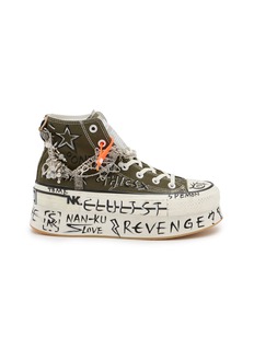 Channel the power of bold self-expression with Nan-Ku Couture's olive green high-top sneakers. Adorned with a dynamic arrangement of chains, charms, and a hand-drawn star, they exude a gritty, streetwise vibe. The vibrant orange lace toggle adds a striking pop of colour against the olive canvas, enhancing the visual interest. Scribbled messages like "Love" and "Revenge" on the thick rubber sole reflect a narrative of passion and defiance.
