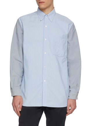 Nanamica's innovative shirt features a striking pinstripe body with contrast sleeves and button-down collar for contemporary hybrid appeal. The relaxed, oversized fit with chest pocket and elongated hem offers versatile styling options. A distinctive wardrobe staple that celebrates Japanese craftsmanship through clever design.