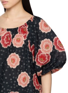 Natalie Martin’s Ella blouse embodies relaxed femininity with its billowing silhouette and artisanal floral print. Crafted from lightweight cotton, it features a soft scoop neckline and voluminous puff sleeves — a breezy companion for sunlit days or resort getaways.