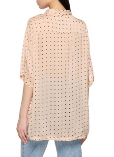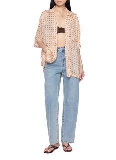Light as air, Natalie Martin’s shirt is rendered in a delicate blush tone with hand-printed polka dots. Featuring a pointed collar, dropped shoulders, and an oversized silhouette, it’s a timeless piece that drapes effortlessly — ideal for tucking into denim or worn loose.