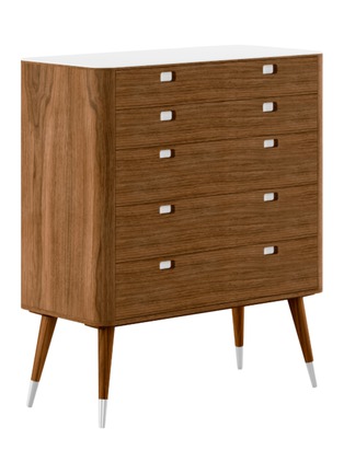 Defined by its confident proportions, this chest of drawers pairs the warmth of walnut with the precision of a white Corian top and integrated handles. Designed by Nissen & Gehl MDD, it features solid maple sides and dovetail-joined drawers, grounded by a sleek steel base that lends architectural clarity to modern interiors.