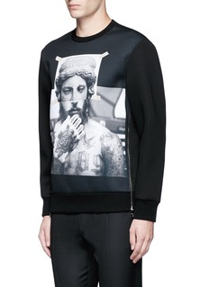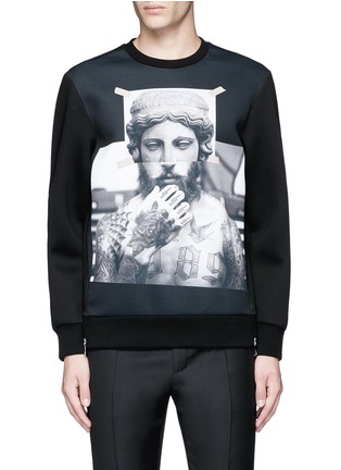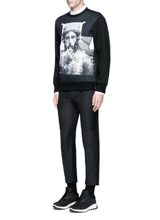 尼奥贝奈特这款卫衣体现了品牌对图像出色的重塑技术,通过分割及拼接把雕塑及人像合二为一,并将标志性的闪电图案化为纹身装饰、融入其中,是低调而富有辨识度的个性设计。