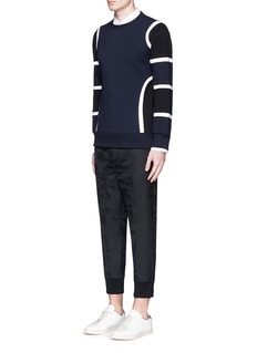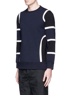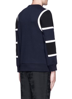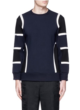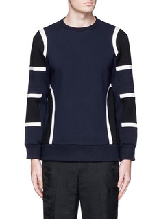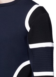 尼奥贝奈特这款卫衣充分展现品牌对拼贴元素的热衷,以品牌常用的深色为主调,黑、白、深蓝色构成几何形块状拼接效果,衣袖加入车缝线点缀,更添朋克气息,让您打造醒目有型的运动休闲风。