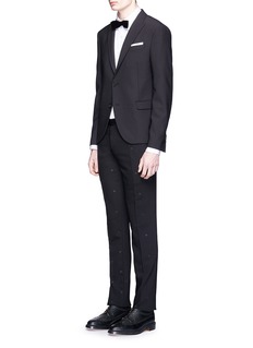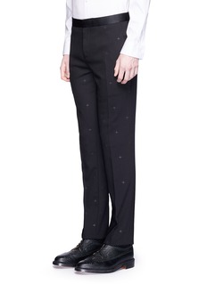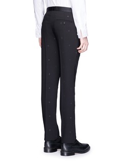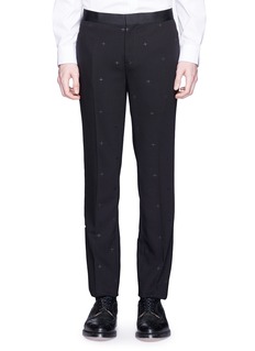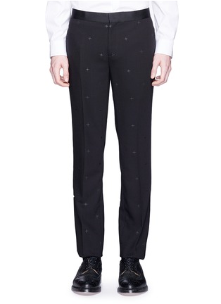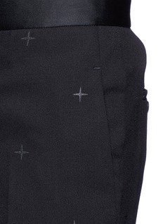尼奥贝奈特这款裤子以品牌标志性的十字星扭转单色设计的单调感,在轻盈的初剪羊毛面料上缀以凹凸触感的十字星提花,缎面拼贴裤腰倍显温文贵气,不妨配搭浅色上衣展现对比鲜明的时尚风格。