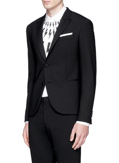 尼奥贝奈特这款西服外套采用高质的混羊毛面料制作,质感顺滑柔软,衣身与带有光泽的缎面衣领形成对比,低调地彰显奢华细致,配合修身剪裁突显您高挑挺拔的身型,让您塑造优雅绅士造型。