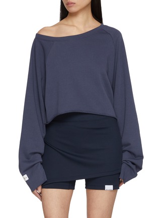 A study in relaxed asymmetry, this cropped long-sleeve top slips off the shoulder with quiet confidence. Cut from mid-weight terry with a soft hand feel, raw-edge finishes and a subtle sleeve logo lend an undone elegance—ideal for studio days or pared-back city looks.
