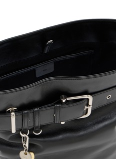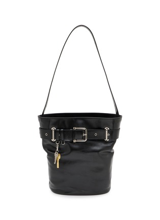 A sophisticated interpretation of utilitarian elegance, this bucket bag showcases equestrian-inspired details. The distinctive belt detail and key charm add heritage appeal, while the structured silhouette maintains contemporary refinement.