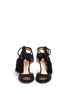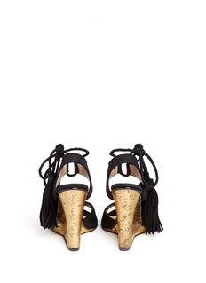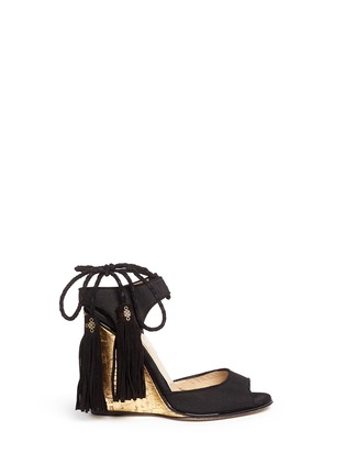 Paul Andrew这款凉鞋以鱼嘴款式突显女性的优雅气质,编织纹理鞋面休闲随性,配合系带设计和流苏点缀,多了份波希米亚风情,金色鞋跟形成经典的黑金搭配,穿上它令人眼前一亮。