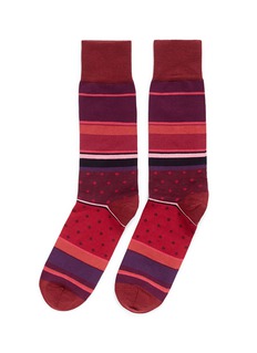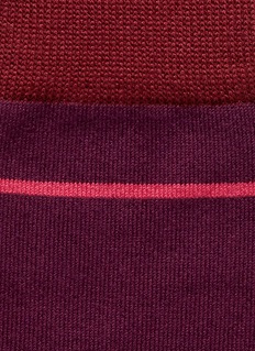 一双精致的袜子可瞬间点亮您的帅气造型,保罗史密斯这款糅合横纹及波点图案,配以紫色拼红色主调,透出热情的活力气息。罗纹袜口的设计有助固定袜子位置,让您享受舒适自在的穿着体验。