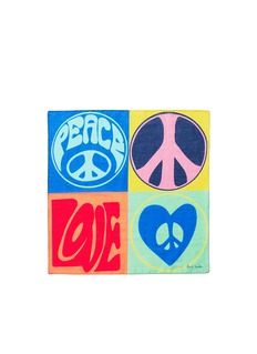 Paul Smith这款袋巾以亮眼方式宣扬和平信息,采用四格造型,每格加入不同色彩,和平符号、心形图案与“Peace”和“Love”字样色彩绚丽,瞬间点亮西服造型。