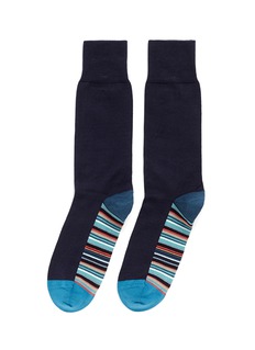 保罗史密斯独有一套色彩美学,建立品牌的英式活力风格。这款袜子将标志性的多彩横纹置于底部,与深蓝色袜身形成趣味对比,是低调而别具辨识度的单品。