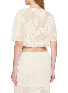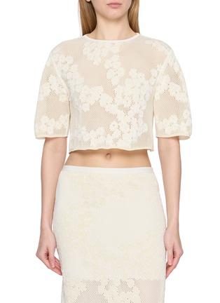 Pepa Pombo channels airy elegance through this intricately knitted cropped top, where delicate floral motifs bloom across a semi-sheer mesh construction. The relaxed short sleeves and clean crew neckline frame the silhouette with ease, making it a refined companion to matching skirts or tailored trousers.