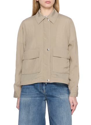 A refined interpretation of utility, this technical jacket is crafted in lightweight viscose nylon with a softly structured hand. The clean point collar and concealed placket create a streamlined front, balanced by oversized flap patch pockets. Layer it over denim or tailoring for effortless transitional dressing.