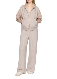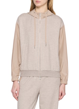 An elevated take on off duty dressing, this hooded jacket merges soft jersey with tonal technical panels for subtle dimension. The streamlined zip front and drawstring hood refine its relaxed attitude, while ribbed trims frame the silhouette. Layer it over coordinated separates for effortless modern ease.