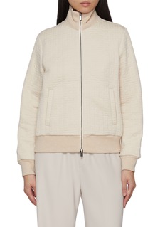 This Peserico jacket redefines sporty elegance with a sculpted silhouette and tonal texture. Crafted from a wool-cashmere blend with a subtle geometric motif, it’s finished with a metallic-ribbed collar and hem for a soft gleam. Ideal for polished layering on cooler days.