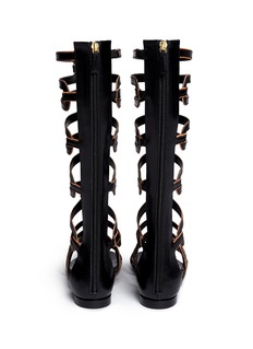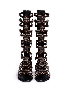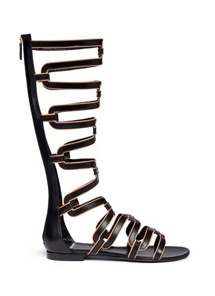 皮埃尔哈迪擅长把建筑美学注入设计之中,这款罗马凉鞋由多根缠绕小腿的搭带组成,层叠交错的镂空线条别具艺术感,驼色与黑色牛皮拼贴塑造出勾边效果,令整体设计更鲜明,彰显您前卫独特的个人风格。