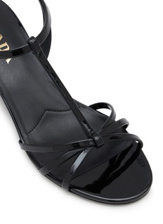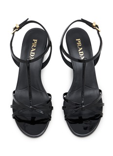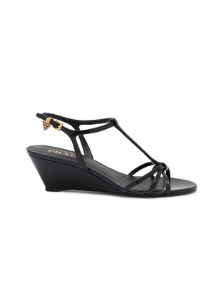 Prada's wedge sandals exude refined elegance with sleek architectural design. The sophisticated silhouette features delicate T-strap construction, interwoven toe straps for visual interest, adjustable ankle buckle with signature triangular logo plaque, cushioned footbed, and tapered wedge heel. Timeless Italian craftsmanship meets modern femininity.