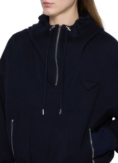 Elevating a casual essential, Prada reinterprets the hoodie in a plush wool-cashmere blend, creating a silhouette that feels both structured and indulgent. The half-zip neckline, zipped pockets and tonal triangle detail introduce a polished, utilitarian edge, making it a versatile layer that moves seamlessly between relaxed tailoring and off-duty refinement.