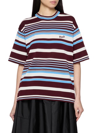 Prada 擅长以极简线条勾勒质感,这款 T 恤用条纹拼接营造复古氛围,短袖剪裁利落舒展,胸口标识为基础款注入品牌辨识度。