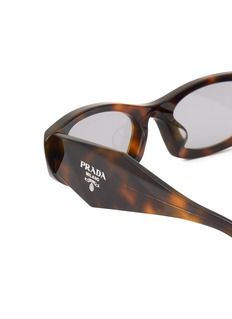 Cast in a rich juniper tortoise acetate, these oval sunglasses balance Prada’s sculptural boldness with a softened, organic palette. The fluid silhouette and wide temples create a modern, tactile presence, while the cool grey lenses lend a grounded contrast—ideal for understated yet directional styling.