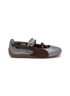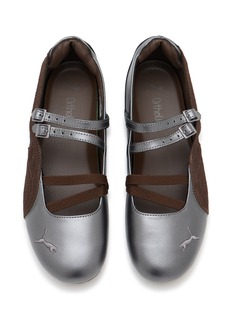 Embrace a blend of comfort and style with the PUMA Mary Jane sneakers. These shoes feature a sleek, metallic silver finish complemented by soft brown accents, creating a sophisticated look. The adjustable strap with embellished buckles ensures a perfect fit, while the signature PUMA formstrip adds a touch of sporty elegance.