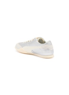 These Puma sneakers epitomize classic elegance with a contemporary twist. Crafted in a sleek, ice-white palette, they are designed with a smooth leather upper that adds a refined touch to your casualwear. The subtle Puma stripe in an understated off-white shade enhances the sophisticated look without overpowering the design. These shoes feature a low-profile silhouette and a durable rubber outsole that provides excellent traction and comfort.