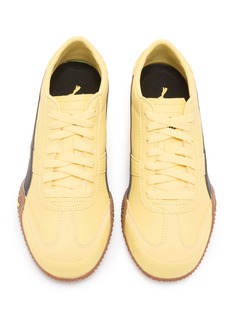 These Puma sneakers are a vibrant addition to any wardrobe, featuring a lively lemon yellow hue that captures attention. The smooth synthetic leather upper is complemented by a contrasting black Puma stripe, adding dynamic visual interest. These shoes are designed with a classic silhouette and a comfortable rubber sole that offers reliable grip and durability.