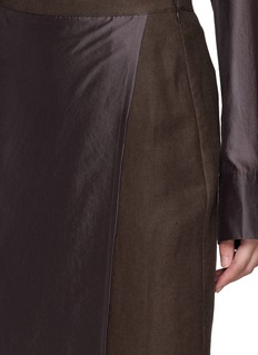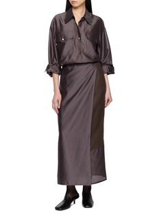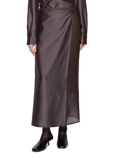 A study in contrast, this skirt layers fluid organza against a structured wool-blend panel, creating quiet movement with every step. The wrap silhouette skims the body with ease, ideal for gallery days or intimate dinners styled with tonal shirting or soft knits.